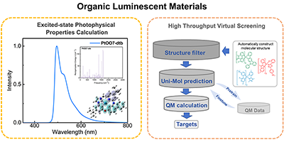 Congratulations to Dr Rongrong Li for the new paper accepted for publication in CSR! The theoretical design of highly efficient, low roll-off and full-color emission organic materials is of great interest, although there are great challenges due to the limitations of the present-day methodology. In this review, we present progress achieved in our group on the theoretical and computational investigation for the structure–property relationships and screening strategy for organic fluorescent molecules, selection of thermally activated delayed fluorescence (TADF) and multi-resonance TADF (MR-TADF) molecules for optically and electrically pumped lasing application, and high-throughput virtual screening of phosphorescent organometallic complexes. We combined a quantum chemistry method with the molecular representation learning model Uni-Mol and rate theory-based molecular material property prediction package (MOMAP) developed in our group. Finally, we outline the limitation of current computational protocols and the future directions for organic luminescent materials. |